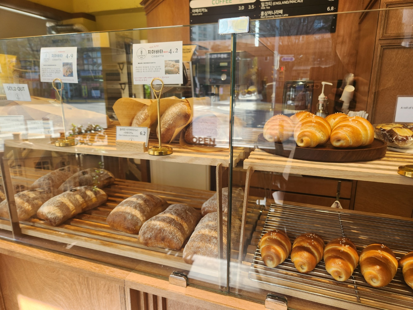 빵집 내부는 온통 원목으로 인테리어가 되어 있어 유럽 시골의 따뜻한 빵집 느낌이 확 들었어요. 2개의 4인용 테이블과 의자가 세팅되어 있었는데 빵과 커피를 시켜 간단히 먹고 가기 편했어요.